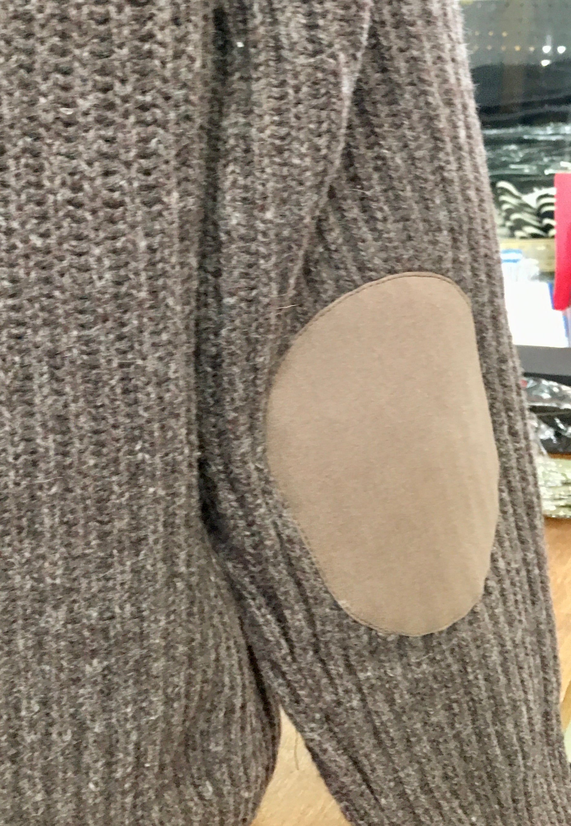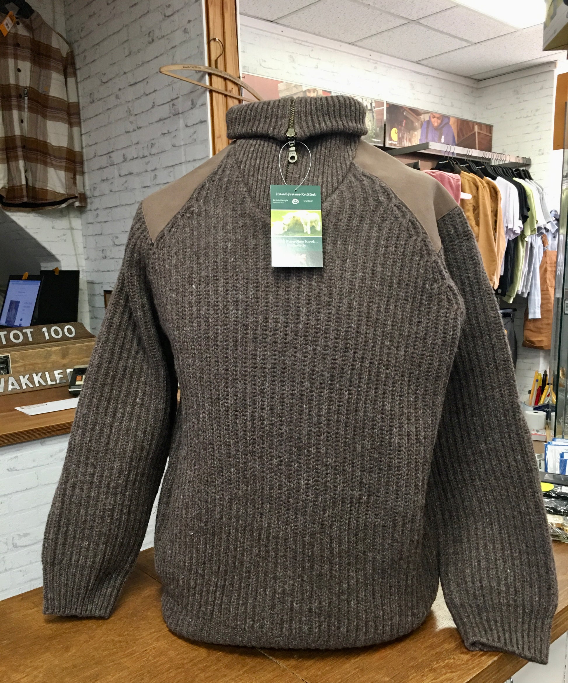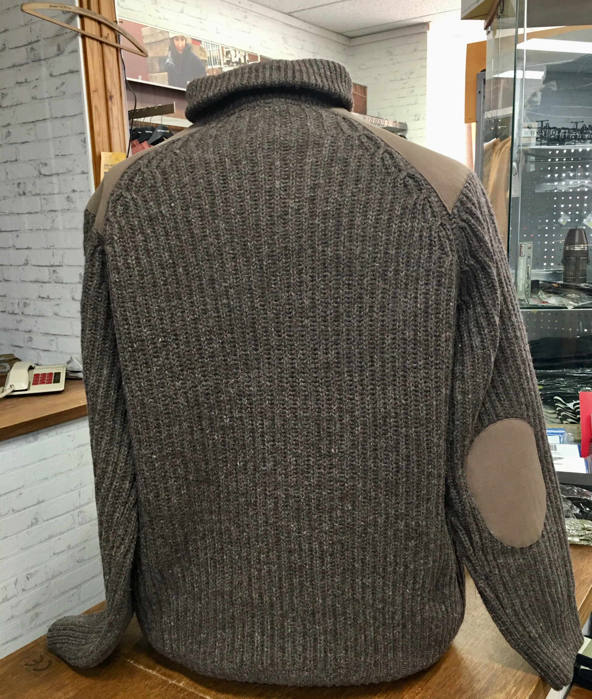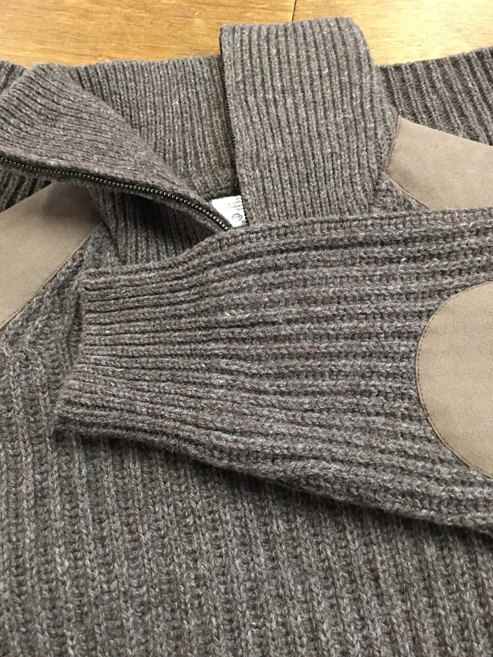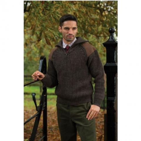 Medium knit gebreide 100% wollen schipperstrui. Wol met ouderwetse "ruwe" feel. Britse "country-style" maar met met de traditionele rits-col van de schipperstrui. afzetstukken op ellebogen en schouder. Functioneel warm en klassieke stijl.