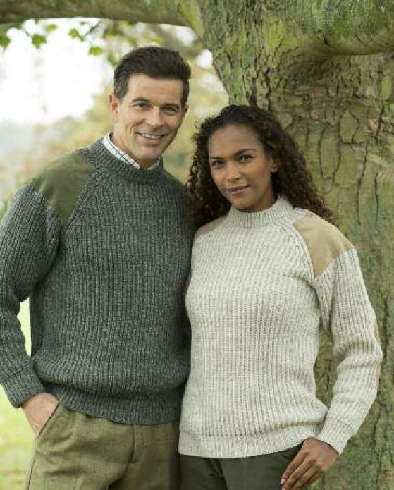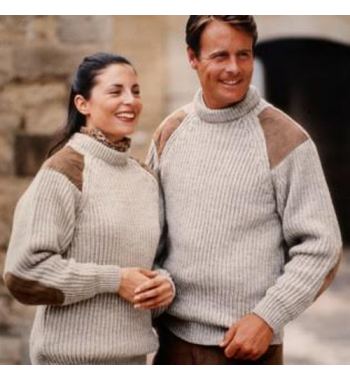 Medium knit gebreide 100% wollen jachttrui. Wol met ouderwetse "ruwe" feel. Britse "country-style" met traditioneeel afzetstukken op ellebogen en schouder. Functioneel warm en klassieke stijl.