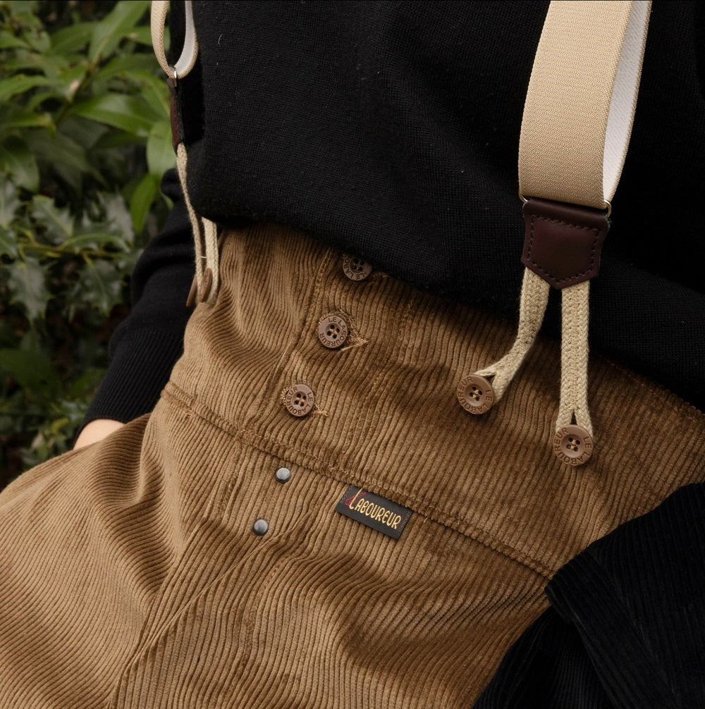 Deze corduroy Franse werkbroek, vaak gedragen met bretels, onverwoestbare “manchester” broek uit een ander tijdperk. Maar deze broek is niet alleen om nostalgische redenen een geweldig kledingstuk. Bij het werken buiten is het nut van een broek met hoge taille snel duidelijk. De broek zit altijd comfortabel op zijn plaats, vooral dankzij de steun van bretels met knopen. De hogere taille en de ontspannen fit zorgen voor een betere bewegingsvrijheid, terwijl het oversized taillepaneel ondersteunt en mooi aansluit. Een traditioneel detail is de achterste “gesp”-riem voor het aanpassen van de taille- en heupafmetingen. Warm in de winter en luchtig door de pasvorm als het warmer weer is.