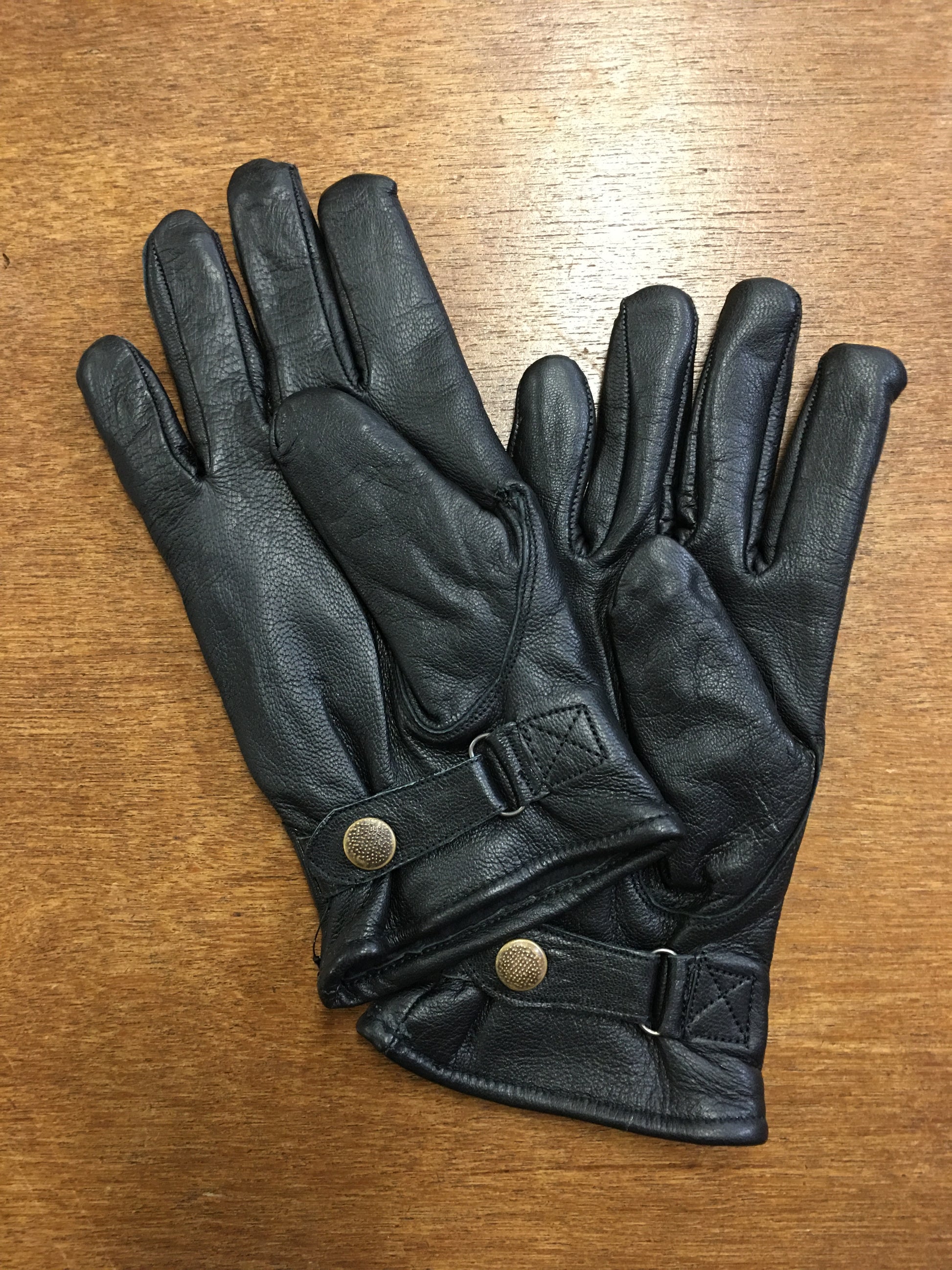 Leren soepele handschoenen met drukknoop. De z.og officiers-handschoen. Zwart leer met zachte voeringsstof. Goede kwaliteit en met een drukknoop sluiting.
