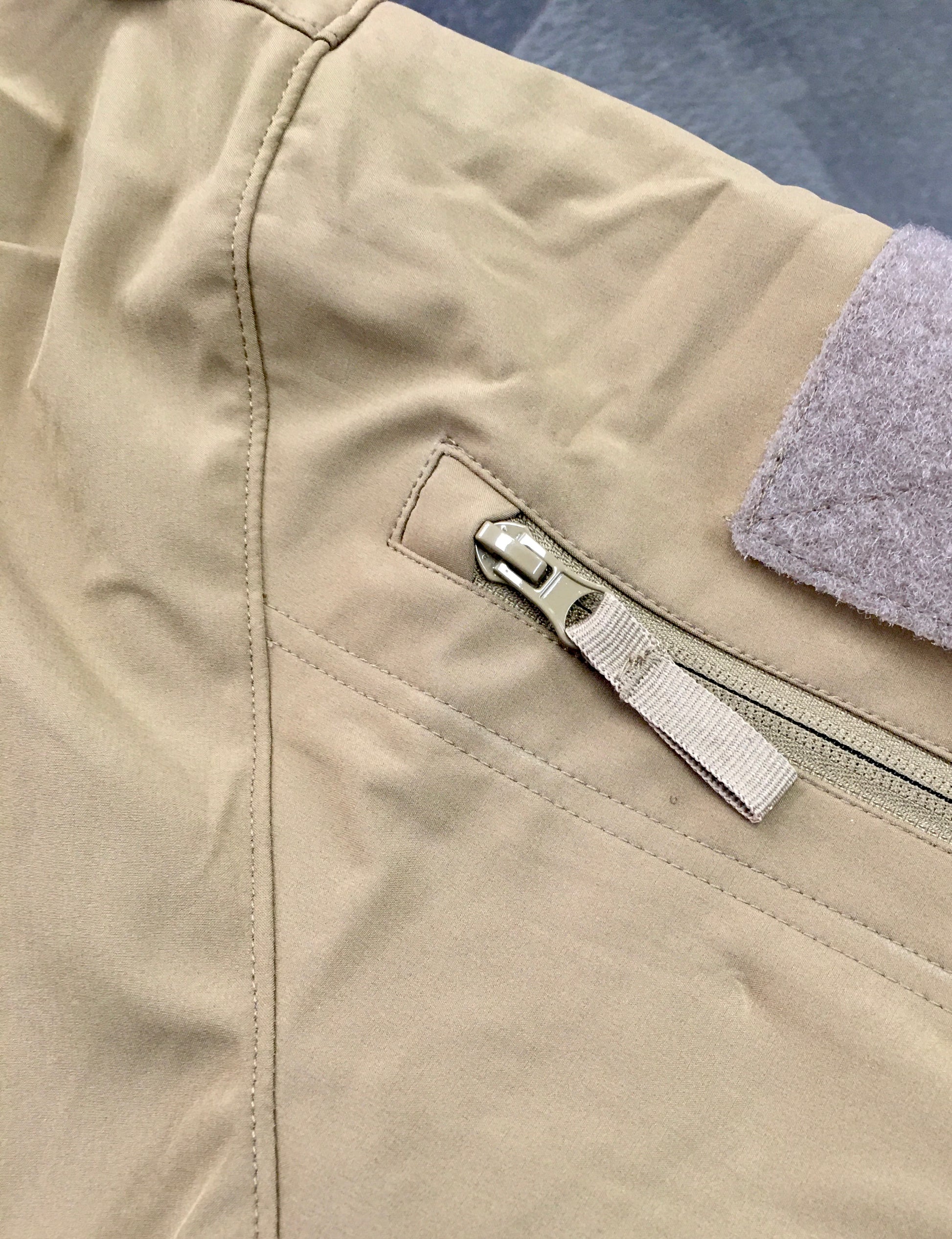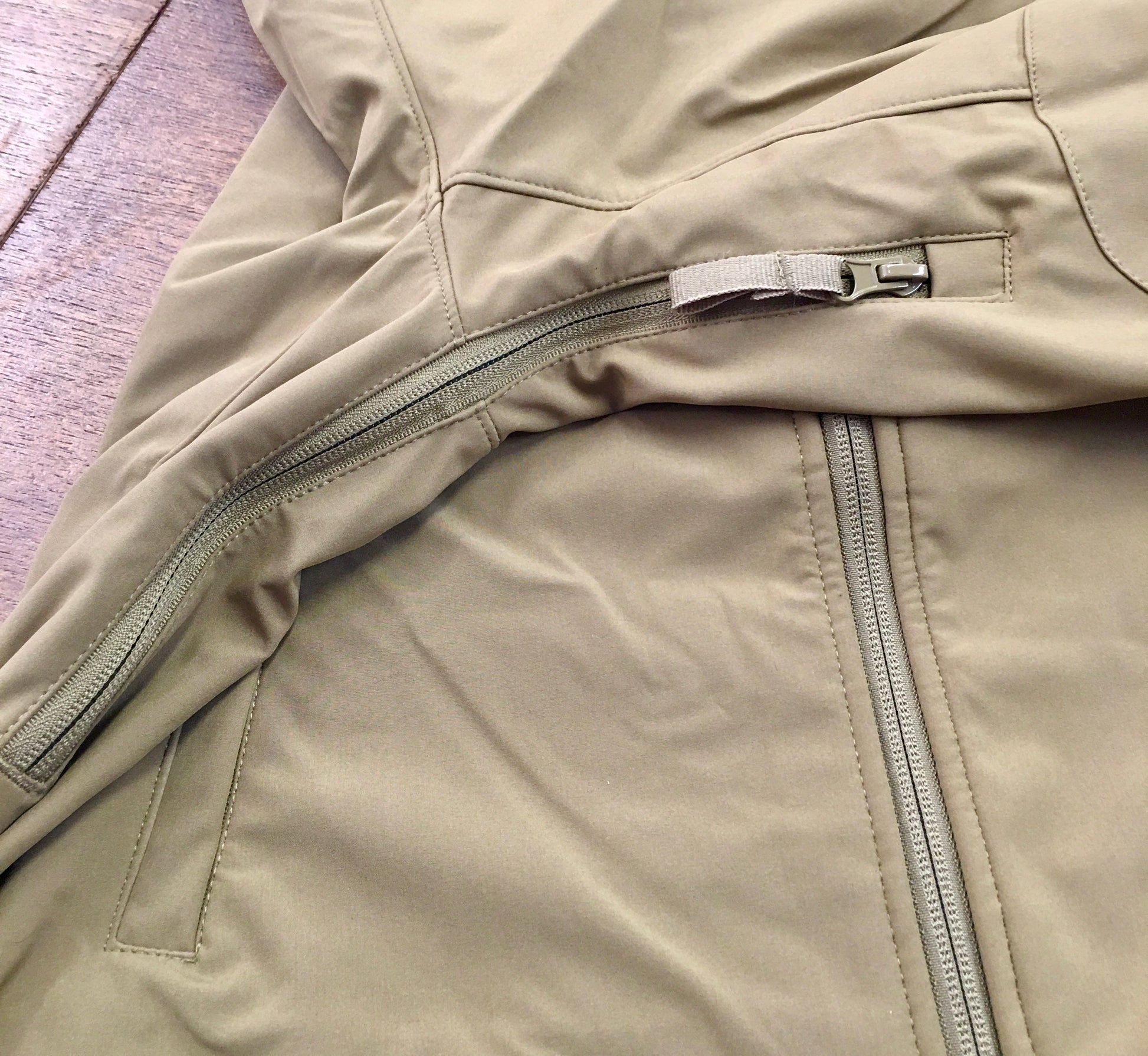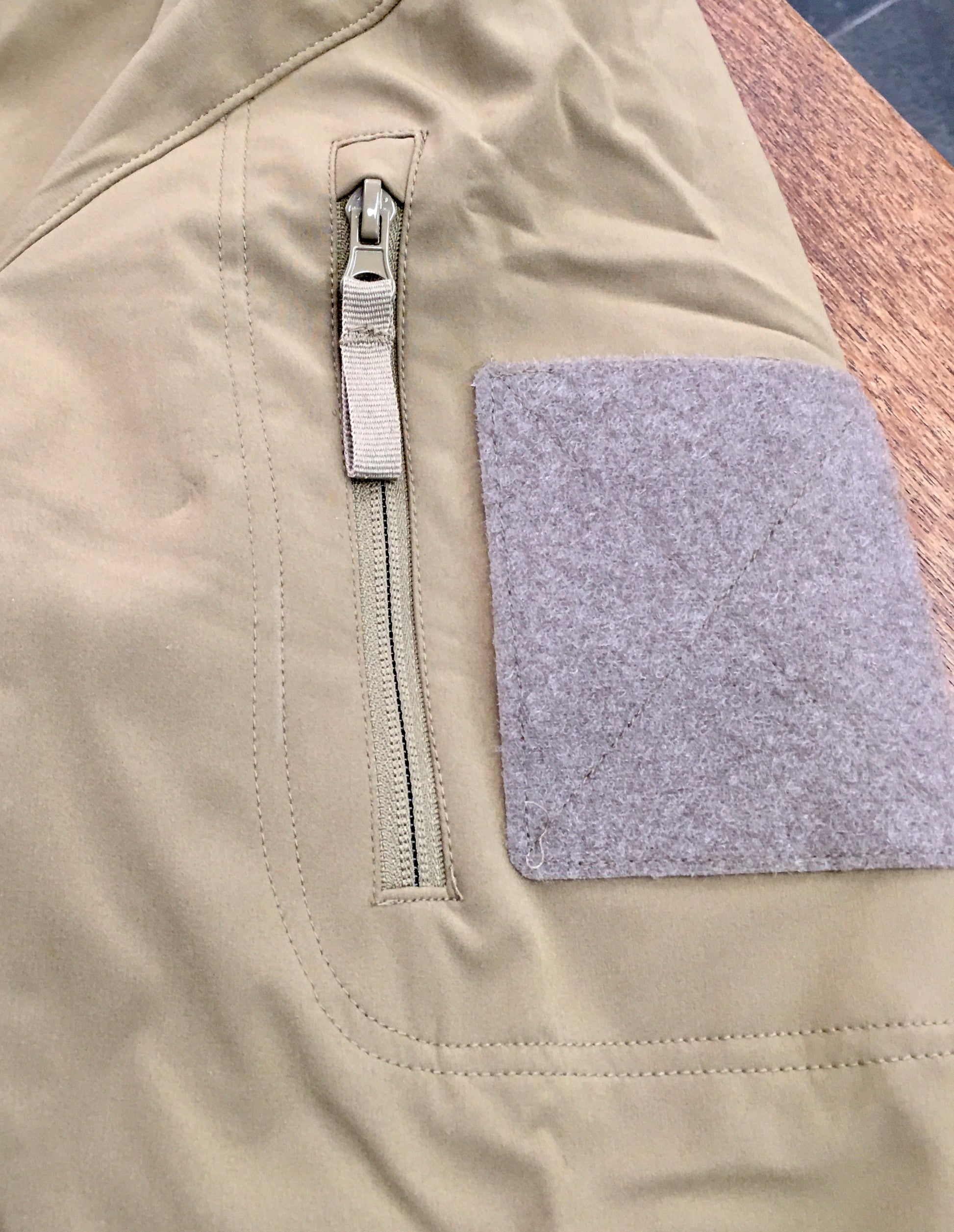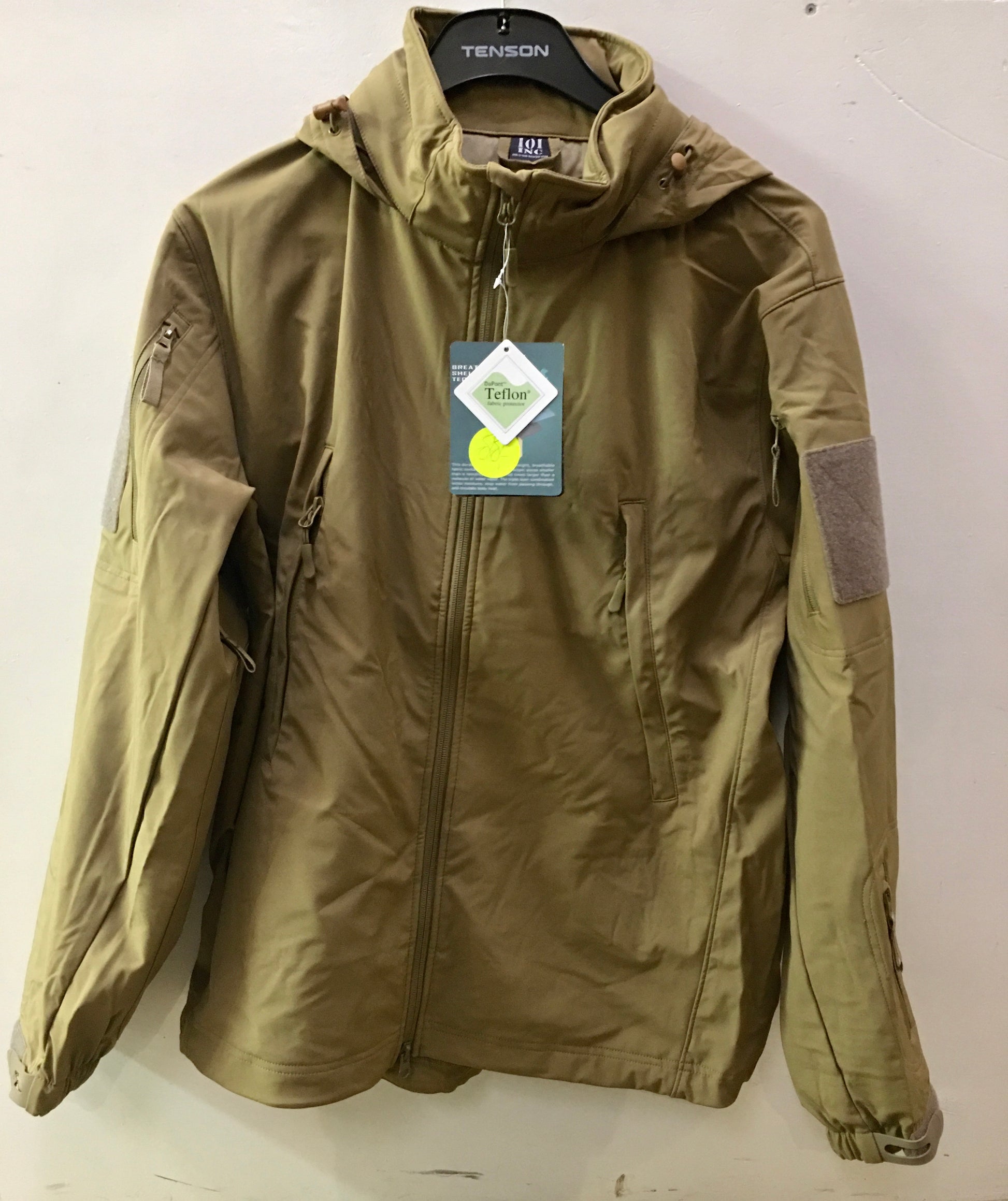 Softshelljack met afneembare capuchon, hoge kraag, zakken met ritssluiting en klittenbandsluitingen. (De eerste foto geeft de werkelijke kleur (coyote) het beste weer. Een bruinachtige zandkleur)