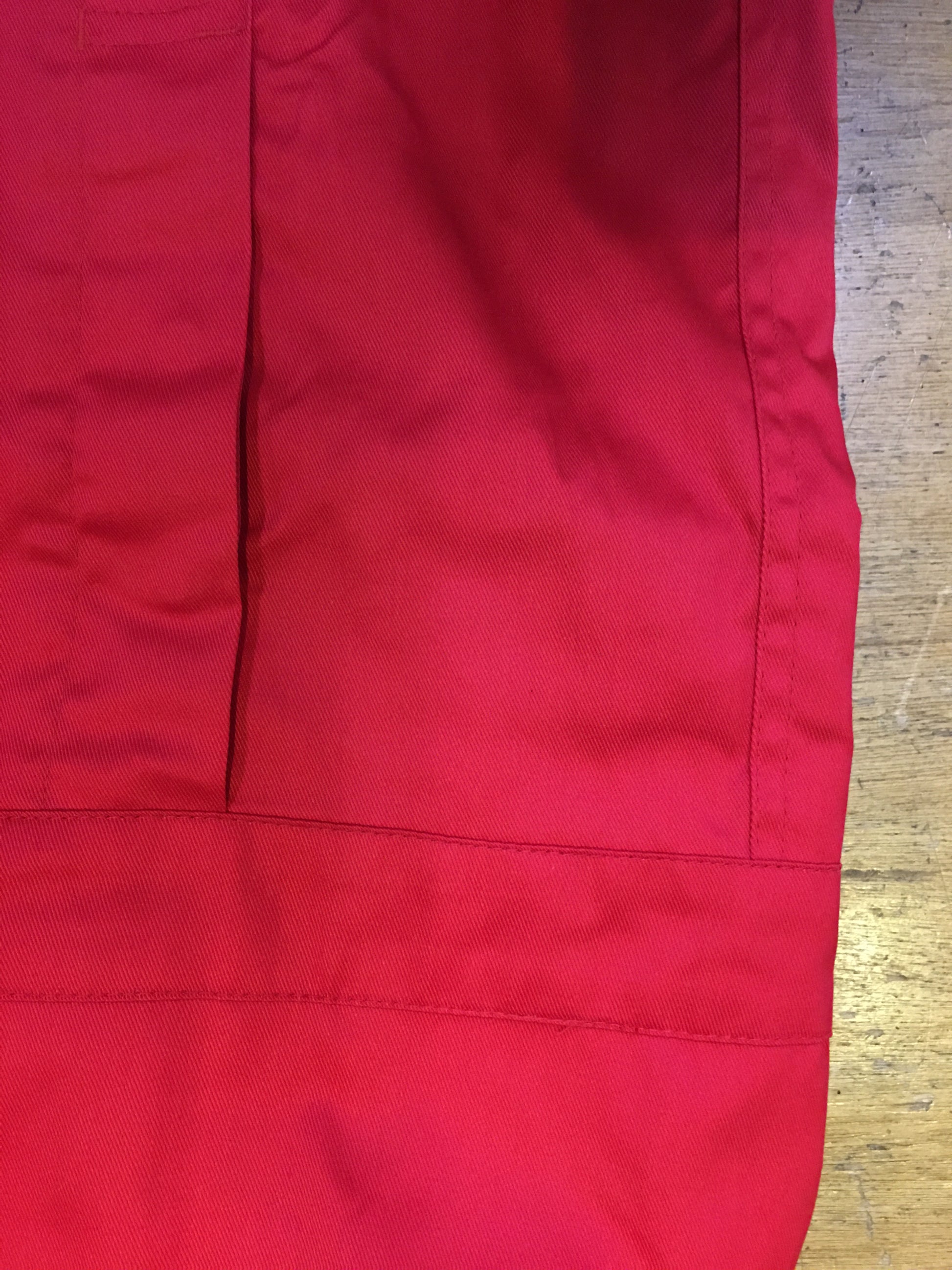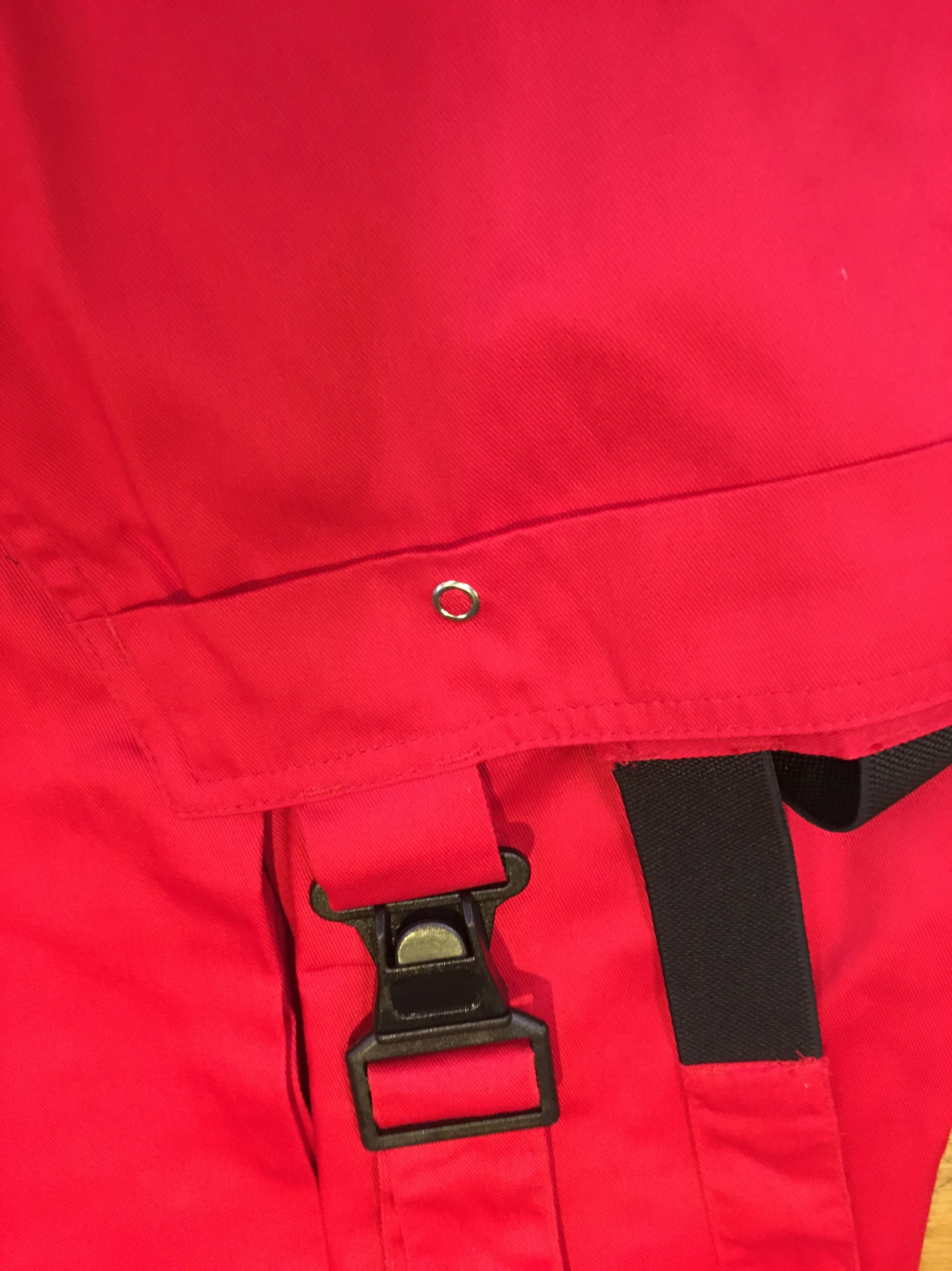 Amerikaanse overall of Tuinbroek van 100% katoen in donkerblauw en khaky, in polyester/katoen in rood. (Rood in [polyester/katoen omdat de rode kleur dan betmakkelijke verstelbare snelsluiting.